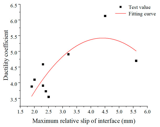 Figure 16 shows the influence of the relative slip of timber–steel interface on the ductility coefficient. When the relative slip value was less than 4.5 mm, the ductility coefficient increased with the increase in slip. When the relative slip value was greater than 4.5 mm, the ductility coefficient decreased with the increase in slip. This implies that within the parameters of the optimal bolt area ratio, increasing the total bolt area can effectively reduce the interface slip of the composite beam and improve its flexural capacity but reduce the ductility coefficient.