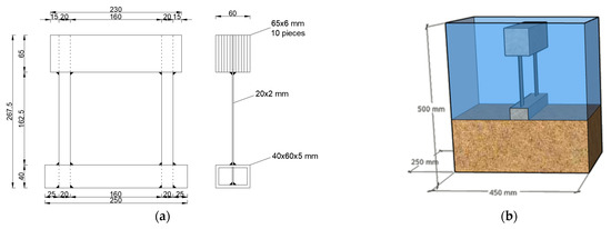 Dynamic tests were carried out on a reduced-scale model with different foundation conditions (Figure 1). The model geometry was based on experimental research of a similar character and scale [50,51,52], and it represents a scaled-down, simplified model of a frame that can be found in a real-size building studied in [12]. A scale model of a one-story steel frame consisting of two columns connected by a rigid foundation and a rigid beam was used. The clear span of the frame bay was equal to 160 mm, while the total length of the frame, including foundations, was 250 mm. The height of the frame, including its foundations and the rigid beam, was 267.5 mm. Mild structural steel of grade S275JR was used for all structural parts of the model. The columns were created with steel sheets 20 mm wide and 2 mm thick and were welded with full penetration welds at the foundation base to a rectangular steel pipe with cross-sectional dimensions of 60/40/5 mm and at the top to a rigid beam, which was created by joining 10 steel plates 65 mm wide and 6 mm thick. The scale model had a total mass of 8.68 kg, the majority of which was concentrated in the rigid beam. The first period of vibration was equal to T1 = 0.48 s (translation in the out-of-plane direction), and the second period of vibration was equal to T2 = 0.19 s (torsional). The modal response was measured with accelerometers measuring the free oscillations of the model after the model was manually induced with a hammer.