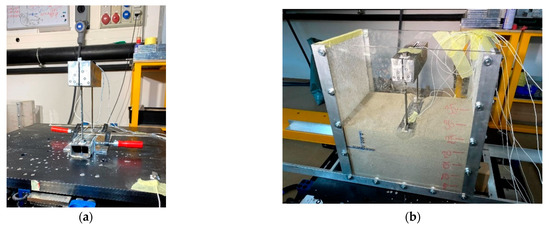 A large number of measuring instruments were used for the purpose of testing. Accelerometers were placed on top of the structure model, on the foundation and on the shaking table. Accelerometers were used to obtain shear wave velocity in sand and to determine the period of vibration of the model before the dynamic test was conducted. The accelerometers had a sensitivity of 4.91 mV/g. Displacements were measured with two optical measuring systems. The first system (marked with number 4 in Figure 2d) was used to measure displacements of the structural model, and the other for measuring the displacement of the soil model (marked with number 3 in Figure 2d). The dynamic response of the structure model was recorded by an optical 3D displacement and deformation measurement system GOM Aramis and Pontos with frequency recording up to 160 fps in full resolution. The measuring volume covered by the system is 2000 mm × 1000 mm × 500 mm. Soil displacement was measured using a GOM Aramis 12 M noncontact optical 3D displacement and deformation measurement system with 12 mm focal length lenses and a speed of 3 images per second.