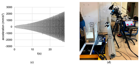 The model was excited by a time-varying sinusoidal waveform (sine sweep function), which is presented in Figure 2c in the out-of-plane direction to determine its fundamental frequency. The model structure was tested for two support cases. First, the tested model was attached directly to the shaking table platform (Figure 2a). Second, the examined model was placed on a layer of compacted sand (Figure 2b) embedded in sand container (Figure 2d marked number 1) The measured experimental data were later used for the calibration of the numerical models, specifically for the parameters regarding SSI.