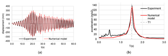 The numerical model of the soil-foundation-structure system was later excited by the same time records as the fixed base model. The response of the experimentally tested and numerical model was compared by comparing the horizontal displacements of the top of the beam (Figure 7a) and the floor spectra (Figure 7b).