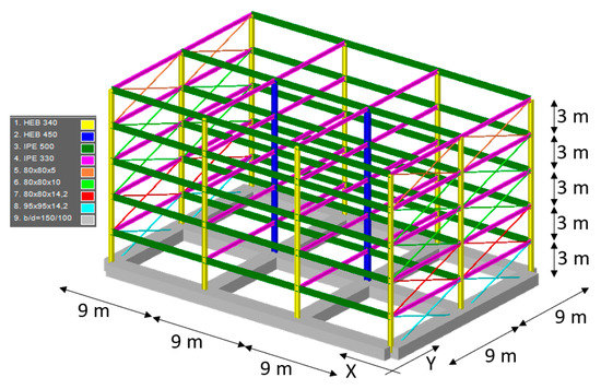 In the second part of the study, the seismic response of a 5-story steel building was investigated using 3D finite element numerical simulation. A fixed-base (FB) analysis as well as soil–structural interaction (SSI) were considered in this research. The selected case study building was designed in accordance with Eurocode 8—Part 1 for the FB case [75,76]. The building consists of three moment-resisting frames with 9-m bay spans in the longitudinal direction (X-direction) and braced frames with 9-m bay spans in the transverse direction (Y-direction), where diagonal bracing was installed on the outermost frames (Figure 9). All elements were composed of steel-grade S275JR. The structure was rock-founded, which corresponds to soil category A according to Eurocode 8—Part 1 [4]. Peak ground acceleration (PGA) used for building design was equal to 0.30 g. The design of the building was created following EN Eurocodes.