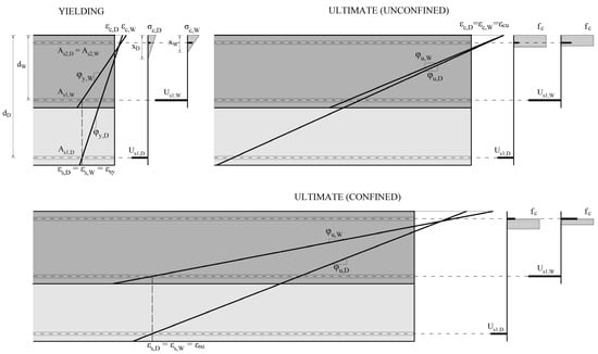 For the evaluation of ϕu,W/D, similar reasoning can be made. In this case, constant concrete stress distribution (i.e., rectangular stress block) is considered (see Figure 1). If confinement is not taken into account, the ultimate deformation state in the section may correspond to failure of concrete in compression; thus, Fc = 0.8·x·bw·fc. Analogously to the previous development, xW/D,unconf = As1,W/D/bW/D = 1/bW/D, and consequently, ϕu,W/D,unconf is obtained as in Equation (A7), and corresponding ductility μϕ,W/D,unconf is expressed as in Equation (A8).