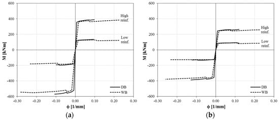 Results for confined cases with asymmetric longitudinal reinforcement are shown in Figure 2. Post-elastic hardening of reinforcement causes that in most cases, Mu > My. In almost all the cases, there is spalling of concrete cover before the attainment of εsu in the tension reinforcement, causing an instantaneous slight drop of M. Hence, ϕuof WB reaches larger values than DB, as predicted. It is worth noting that the increment in secant-to-yielding stiffness for high-reinforced sections with respect to low-reinforced ones is rather similar to such an increment in total reinforcement.