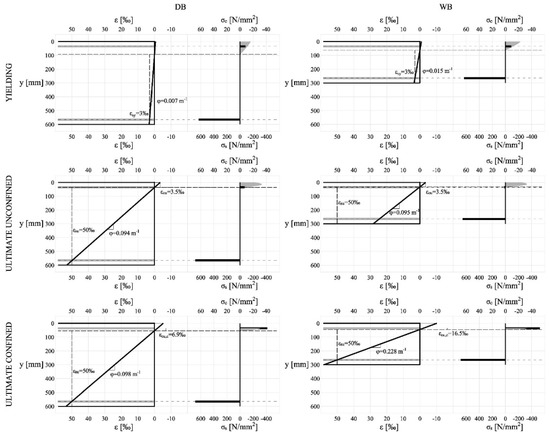 In most cases, simplified assumptions made in the preliminary considerations (pre-emptive yielding of steel, concrete and steel failure in unconfined and confined sections, respectively, quasi-linear behaviour of concrete until ϕy, negligible values of x with respect to d, similar top reinforcement stresses at ϕy, etc.) are confirmed, and estimated values of ϕ and μϕ are predicted with error lower than 10%. In Figure 3, one of the couple DB-WB is studied in detail. It corresponds to a case in which WB presents approximately half the depth and double the width of DB; thus, the cross-sectional area is rather similar. The results confirm the predictions: WB shows double ϕy, similar ϕu,unconf, and more than double ϕu,unconf compared to DB.