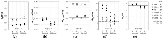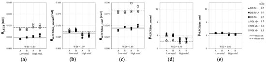 In Figure 5b,c, θu values for unconfined and confined cases, respectively, obtained following the EC8-3 fundamental approach, are shown. Lpl of WB is 0.86 times that of DB, on average. This is exactly the ratio between mean values of θu,W/D/ϕu,W/D for confined beams (see Figure 4c and Figure 5c); however, for unconfined beams, still larger θu values for WB rather than for DB are shown, notwithstanding the lower Lpl for WB, because in this case, large yielding deformations are not negligible with respect to ultimate ones. Consequently, μθ is 40% lower for WB rather than for DB for the unconfined section, while similar ductilities are expected for confined beams (see Figure 5d and Figure 5e, respectively).