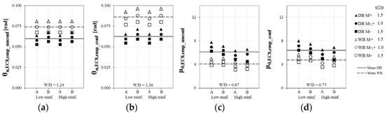 Figure 6a,b corresponds to θu for unconfined and confined cases, respectively, obtained following the EC8-3 empirical approach. The relative positive influence of confinement on WB is quite lower than for the fundamental approach: the mean increment in θu is only 16% instead of 125%. For unconfined beams, notwithstanding the similar ϕu for WB and DB, higher values of θu are observed for WB rather than for DB; in fact, the implicit equivalent plastic hinge length is 32% higher for WB, on average. Instead, for confined cases, mean Lpl,eq,W/D = 0.62, which is more consistent with explicit values within the fundamental approach. The lower influence of confinement on WB causes that, even on confined beams, μθ is 25% lower for WB than for DB.