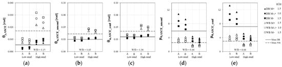 Results for all the cases are shown in Figure 4, in which mean ratios between WB and DB are indicated as W/B in the bottom of the graphics. In general, more satisfactory values are obtained for asymmetric reinforced sections in positive bending than in the rest. For unconfined cases, high-reinforced sections show much poorer performances in terms of μϕ than low-reinforced sections (almost half values), while for confined sections, the bias is much lower.