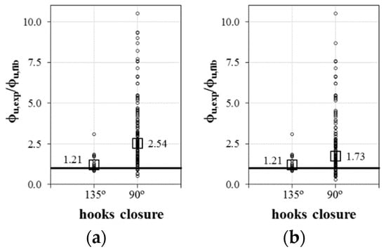 Comparison of experimental and predicted ϕu for all the DB of the database, considering 90°-hook closed stirrups as (a) ineffective and (b) fully effective aimed at confining of concrete core; mean values with square marker.
