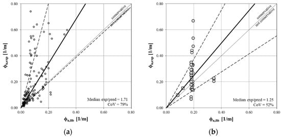 Conversely, quite poorer fitting is shown for ϕu. If stirrups with 90° closed hooks are assumed to not provide any confinement at all, corresponding beams show large underestimation of ϕu than the rest (see Figure 9a). In fact, this assumption is intended to be feasible for design purposes, given that it furnishes conservative results. However, the real influence of hooks on stress–strain models is not clearly quantified; a modification of Mander’s confinement model for columns with 90° closed hooks is proposed in [32]. If full confinement is assumed for beams with 90° closed hooks in which some confinement would be expected if 135° closed hooks were used (i.e., in beams with α > 0), the error reduces largely (see Figure 9b), even when only 56 out of 277 beams belong to this group. Regarding the application of fundamental approaches for the estimation of θu (based on ϕ values), the last assumption is adopted herein. For empirical approaches, it is not relevant because the influence of confinement is significantly lower (see Section 1) and also because, in the particular case of the present database, beams with 90° closed hooks show lower density of stirrups, thus providing low values of α.