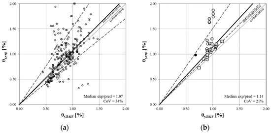 All the graphics presented in the following show (i) the median value—which is intended to be more representative than the mean in the case of large dispersion [23]—of single experimental-to-predicted ratios, which is indicated as “Median exp/pred” and which corresponds to the slope of the plotted thick line; (ii) the 16th and 84th percentiles (associated with standard deviation in a normal distribution), corresponding to the slope of the dashed lines; and (iii) the coefficient of variation (CoV).. It is also indicated in each case which half of the graphic corresponds to conservative results (i.e., when formulations provide overestimation at yielding and underestimation at ultimate deformation).