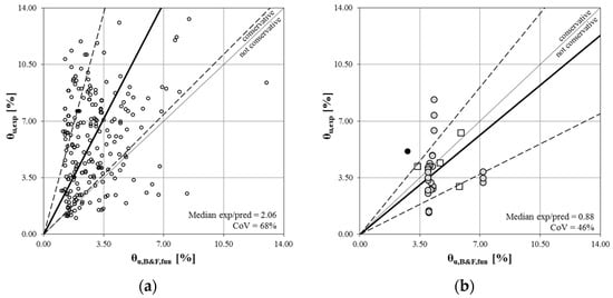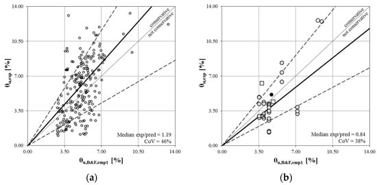 The B&F’s fundamental approach (see Figure 14) shows rather similar underestimation of θu for WB (median values of 0.88), but the overestimation for DB is huge (2.06), even when curvatures corresponding to perfect confinement also for 90° closed hooks are assumed. This may suggest that values of Lpl are highly underestimated for DB and overestimated for WB, even when they are higher for DB rather than for WB as they increase with hb. Conversely to the empirical approach, experimental-to-predicted ratios do not show significant bias when disaggregated for the different sub-groups (i.e., loading, steel, etc.). For the merge of sub-databases, a weighted median ratio of 1.16 is shown.