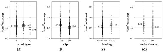 Experimental-to-predicted ratios of θu according to the empirical formulation in [26] for DB, disaggregated for different cases: (a) steel type (H: hot-rolled; T: tempcore; C: cold worked); (b) slippage; (c) type of loading; and (d) hook closure beams.