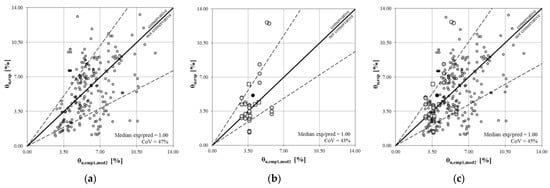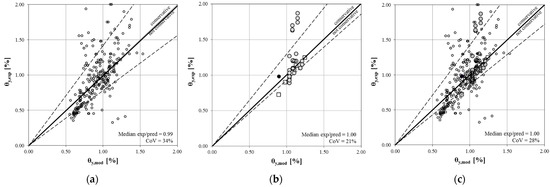 Firstly, the form of the expressions is chosen. Four different forms for the corrected empirical formulations for θu are proposed; they are shown in Equations (6)–(9), in which parameters C1 and C2 are defined in each formula for best fitting, i.e., experimental-to-predicted ratio equal to 1.0 and the lowest dispersion. Aimed at easing the awareness of the differences between formulations, some of their members are condensed with respect to the original expression in Equation (A22) (see Appendix B): a = ast[1 − aold·acy(1 + 0.25apl)/6](1 − 0.43acy)(1 + asl/2); kα = 25α·ωw; kρ = 1.25100ρd; kω = (max{0.01;ω}/max{0.01;ω′}·fc)0.225.