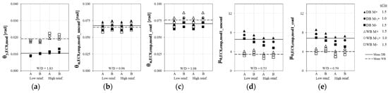 Finally, in Figure 7b,c, θuvalues for unconfined and confined beams, respectively, corresponding to the ASCE approach, are presented. Values of θy (Figure 7a) correspond by definition to a constant degradation of 30% from the uncracked gross stiffness; thus, much larger differences between high- and low-reinforced sections are observed. Values are much lower (about half times) than in both EC8-3 approaches for confined cases, because within this method, increment due to confinement is very low. The differences in θu between the different cases are only due to the contribution of θy, because values of θpl are rather constant for all the beams. It is worth noting that similar mean ratios between θu,W/D for confined sections are obtained with ASCE and EC8-3 empirical approaches: about 1.37. According to the ASCE approach, WB shows less than half the μθ of DB (see Figure 7d,e).