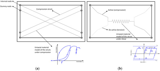 Modeling strategy adopted for the masonry infill walls: (a) under compression; and (b) under shear.