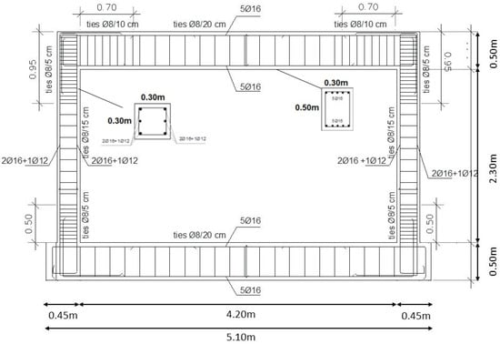 The frame was designed for a medium-ductility class according to Eurocode 8 recommendations [1]. The columns’ cross-sections are 300 × 300 mm2 with longitudinal reinforcement of 4ø16 + 2ø12 and a transversal reinforcement of ø8//50 mm, along with the plastic regions, and ø8//150 mm in the remaining column extension. Concerning the beams, the cross-section is 300 × 500 mm2 with a longitudinal reinforcement of 5ø16 + 5ø16. The geometry and reinforcement detailing are shown in Figure 2.