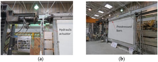 Test setup of the in-plane experimental tests: (a) detail of the hydraulic actuator; and (b) lateral view.
