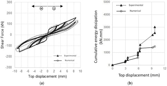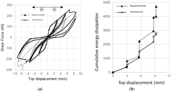 Numerical simulation of the specimen Inf_14 (wall w/ opening): (a) force–displacement curves; and (b) cumulative energy dissipation.