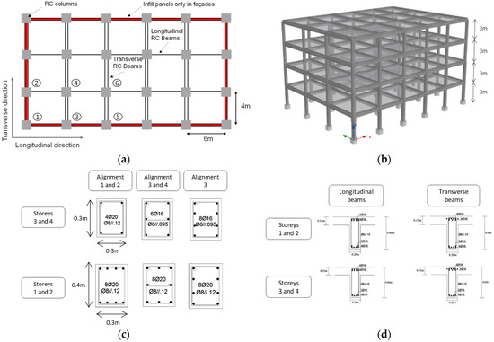 The building selected for this research work is a four-story RC structure designed by the Portuguese Civil Engineering Laboratory and is representative of the common RC structures that can be found in the Portuguese building stock [30] designed according to the Portuguese seismic code. The building has a frame-resisting system and is symmetric in both directions. The building plan is 20 × 15 m2 and has five bays, 6 m long, along the longitudinal direction and three bays, 5 m long, in its transverse direction, as shown in Figure 6a. The building inter-story height is 3 m, as shown in Figure 6b. The cross-section of the columns is: 400 × 300 mm2 (Stories 1 and 2) and 300 × 300 mm2 (Stories 3 and 4). The columns’ cross-section is presented in Figure 6c. All the beams have a rectangular section of 200 × 500 mm2, and their reinforcement detailing is shown in Figure 6d. The slab thickness was designed to be 150 mm thick.