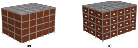 The structure was designed without explicitly considering the infill walls’ presence, i.e., its own weight was only considered. The building’s structural design assumed a global vertical load of 6.15kN/m2 plus a variable load of 2.5 kN/m2. The concrete class is C25/30, and the steel reinforcement grade is A400 [34]. Three 3D models were generated in SeismoStruct [23], considering different configurations, namely: (i) “BF model” is the model that simulates a bare frame configuration (only infills’ gravity load was considered); (ii) “FI model” is the model that simulates the RC structure with infill walls without openings, shown in Figure 6e; and (iii) “PI model” is the model that simulates the RC structure with the walls with a central opening, shown in Figure 6f.