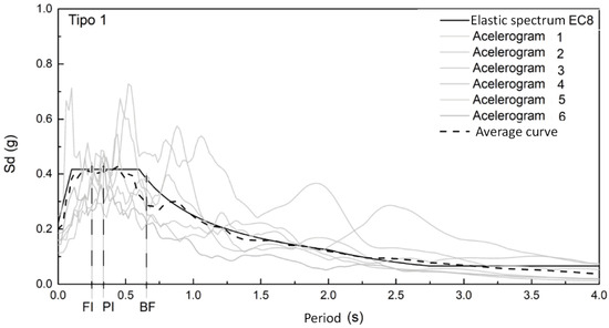 Nonlinear incremental dynamic analyses were performed to study, with more precision, the dynamic behavior of the models with and without walls. Six real seismic records were used and progressively scaled to obtain the corresponding evolution of the maximum inter-story drift ratio and the base shear, as a function of the PGA intensity level (Figure 8). Each of these earthquakes was characterized by two independent accelerograms (one in each direction, longitudinal and transverse), which were simultaneously scaled in both directions. The PGA value was obtained by a quadratic combination of the maximum acceleration of each of these accelerograms. The scaling of each earthquake was intended to capture all phases of the structure response, from the elastic domain through yielding to the structure’s global nonlinear behavior, which, from the software point of view, begins to manifest itself with difficulties in numerical convergence of the analyses.
