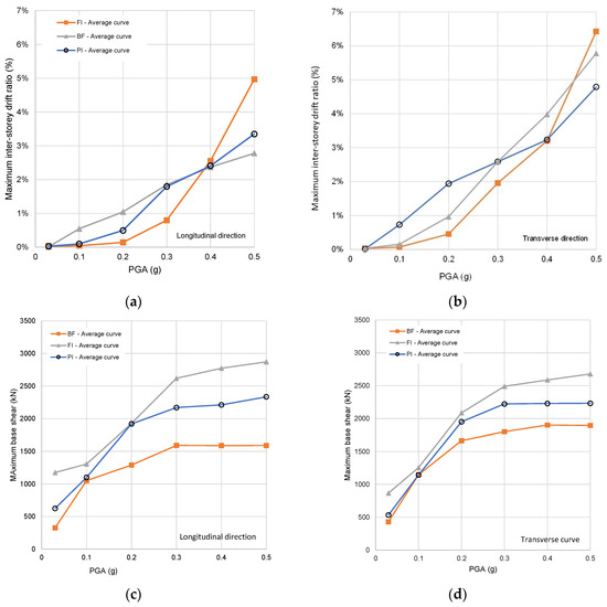 The average curves of the maximum inter-story drift values derived by the model for each pga of each accelerogram are plotted in Figure 9a,b. Analysis of the curves shows that, for pga lower than 0.3 g, the most vulnerable models are the BF (longitudinal direction) and PI models in the transverse direction. It is possible to observe that the evolution of the inter-story drift ratio of the FI model is similar in both directions, i.e., it increases significantly for pga higher than 0.3 g. The seismic response of the models appears to be slightly different in the longitudinal and transverse directions. For pga higher than 0.4 g, the FI model obtained the highest inter-story drift, followed by the BF and PI models.