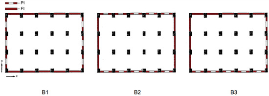 However, all scenarios show the in-plan distribution of two different wall models, without opening (FI) and with opening (PI). The first two, B1 and B2, are symmetric in relation to the two main directions, longitudinal and transverse. Scenario B3, in addition to the irregular in-plan distribution of the walls with openings, presents an asymmetric configuration.