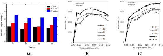 Parametric study B: (a) natural frequencies; (b) capacity curve (longitudinal direction); and (c) capacity curve (transverse direction).