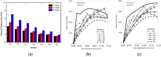 Parametric study C: (a) natural frequencies; (b) capacity curve (longitudinal direction); and (c) capacity curve (transverse direction).