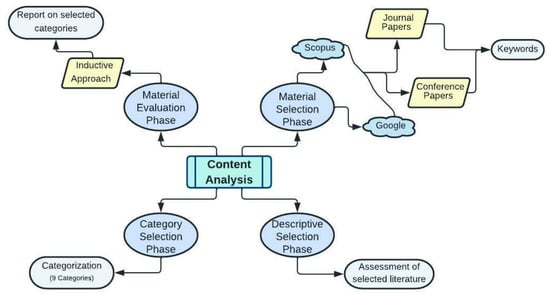 A systematic review and content analysis-based review method was used for the literature review since it enables objective review and reporting in research. It also creates a systematic procedure to identify, classify, and report on the collected literature, as shown in Figure 1. Content analysis was conducted in this research as detailed by [24,25]. It consists of four phases as shown in Table 1 and detailed below.