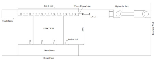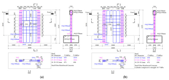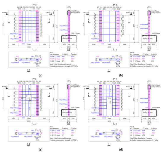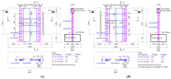 Huang [16] conducted a series of tests on four different SFRC shear walls, all under ALR = 0. Each specimen consisted of a base beam, a wall, with or without opening, and a top beam. The detailed geometry and reinforcement of the reference specimens are shown in Figure 1, while the material constitutive laws are presented in the following section.