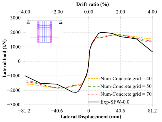 Accuracy of load–displacement curves with respect to experimental test SFW-0.0 using different concrete grids.