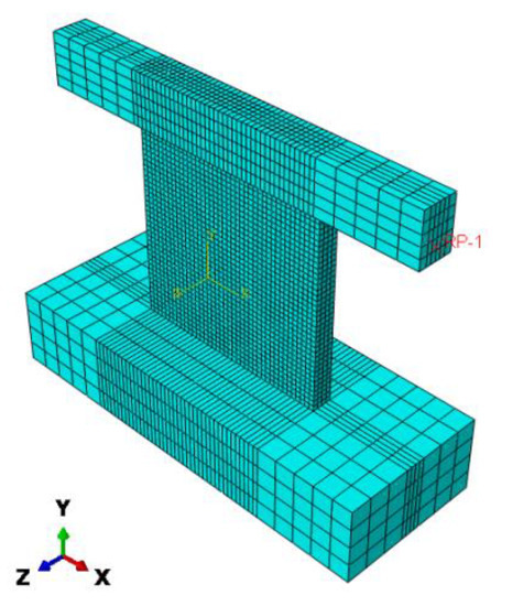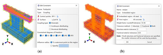 The schematic illustration of the test setup geometry is shown in Figure 5, and the corresponding boundary condition and loading position and direction is shown in Figure 6. For the application of horizontal loading, in order to simulate the actual boundary conditions and avoid stress concentration, a point (the height of the point from the base top surface is 2030 mm) located on the side surface of the top beam is coupled with the four vertical planes of the top beam (Figure 7a). The steel reinforcement (T3D2 truss elements) is embedded within the concrete elements and fully bonded to them, as shown in Figure 7b. The analyses are carried out in three steps: (1) the bottom beam is fixed at the base (Figure 8), (2) a constant vertical load is applied (Figure 8a), (3) the horizontal load is applied (Figure 8b). The loading history of reference experimental study is shown in Table 7. It is worth noticing that, while in the reference tests each level was cycled three times, in the numerical analyses the load was applied monotonically to reduce the computational time. This implies that the accumulated damage in each cyclic sequence was neglected. However, because the comparisons carried out in the following section are based on monotonic quantities, the ensuing considerations can be maintained.