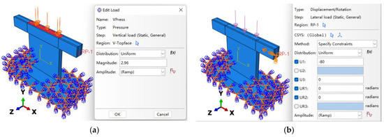 Application of loads (a) vertical load of FE model; (b) horizontal load of FE model.