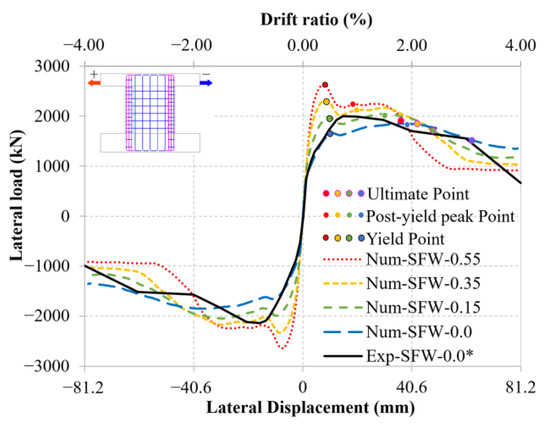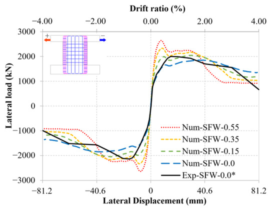 Specimen SFW: comparison of skeleton curves between test and numerical results. (*) denotes that the data were obtained from the experimental tests by Huang [16].