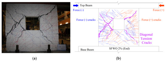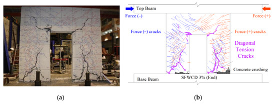 Shear walls are the main structural members to resist vertical and lateral forces in high-rise buildings in seismic zones, thanks to their high vertical load capacity and high lateral stiffness and resistance. An important parameter affecting the lateral load and deformation capacity of shear walls is the axial load ratio (ALR) [1,2,3,4]. Shear walls at the lower stories of high-rise buildings have relatively high axial load ratio (ALR), which may induce significant damage when combined with horizontal earthquake forces. Particularly, concrete at the bottom corners can be easily crushed under seismic conditions [5]. Typically, shear walls are endowed with doors and windows, which often cause stress concentration around the openings [6]. Moreover, shear walls show a brittle behavior, mainly due to the low tensile strength of concrete. In this respect, several studies [4,7,8,9,10] demonstrate that the addition of steel fibers can improve the tensile strength of concrete, and show that shear walls cast using steel-fiber-reinforced concrete (SFRC) exhibit a better deformation capacity. While, in general terms, the adoption of SFRC may be beneficial for the overall behavior of shear walls, it is still unclear how this can be affected, both by the presence of openings and by high ALR.
