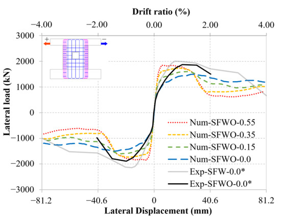 In this section, numerical analyses are presented to explore the effects on the lateral response of SFRC shear walls of different ALRs, of different openings configurations, and of different reinforcement ratios. In these analyses, the FE models presented in the previous section were used, after being calibrated against the experimental tests by Huang [16]. Having obtained accurate predictions for all four tests considered, the FE models were then used to model the response of SFRC walls under different combinations, not considered in previous experimental tests, of ALR, openings, and reinforcement ratio (Table 8).