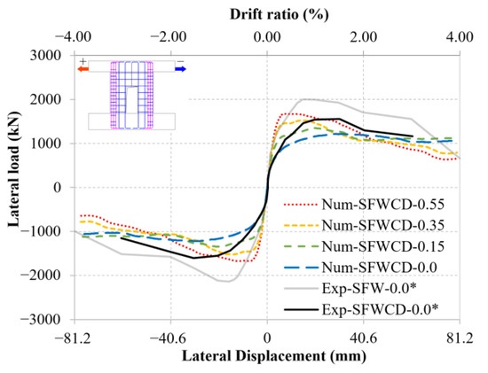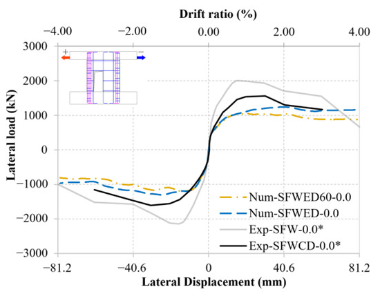 Specimen SFWED: comparison of skeleton curves between numerical results of SFWCD and SFWED. (*) denotes that the data were obtained from the experimental tests by Huang [16].