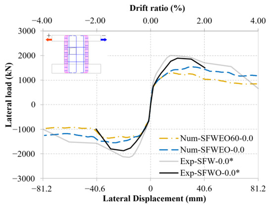 Specimen SFWEO: comparison of skeleton curves between numerical results of SFWO and SFWEO. (*) denotes that the data were obtained from the experimental tests by Huang [16].