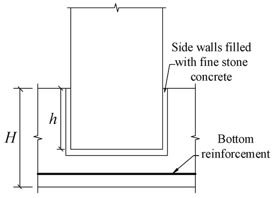 With the improvement of the requirements of modern precast structures, the traditional socket connections cannot meet engineering needs anymore, so an improved socket structure needs to be proposed. To improve the bearing capacity of the cap, the side of the socket in contact with the pier can be used as a breakthrough. By adding trapezoidal shear keys on the side contact surface and using the shear keys to provide shear force, the resisting moment of the contact part can be increased, thereby reducing the socket’s depth, as shown in Figure 2. At the same time, an anti-punch hanging bar is added inside the cap to increase the vertical punching-shear bearing capacity of the cap. It should be noted that U-shaped steel bars are reserved at the bottom of the groove of the cap, and after the core-filled concrete is poured in the pipe pier, an effective constraint will be formed between the bottom of the groove and the bottom of the pier. This constraint applies only to the structural connection between hollow piers and socket caps, and this type of structure cannot be used for solid piers. The existence of this structure makes the socket depth of hollow piers shorter than that of solid piers of the same diameter. This structure is related to the flexural capacity of bridge piers under horizontal loads. The details can be found in reference [6].