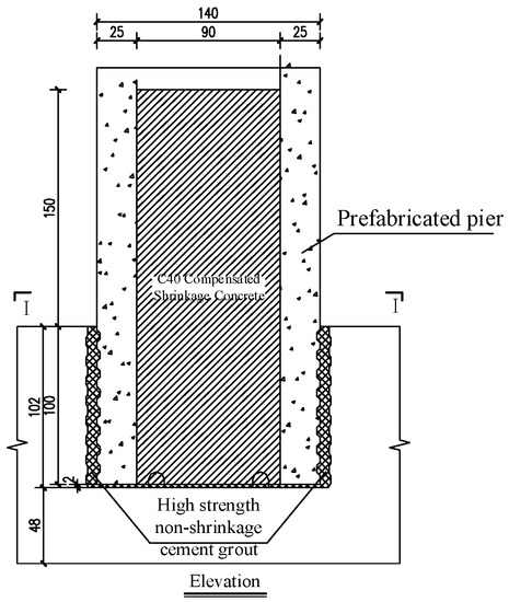 In traditional socket-type structures, the precast pier body is directly inserted into the reserved hole of the foundation, and a certain thickness of mortar is laid at the bottom. There are no steel bars connected between the bridge pier and the foundation. The foundation can be cast-in-place or precast. The advantage of this connection structure is that the construction process is simple and the amount of on-site work is limited [4], as shown in Figure 1.
