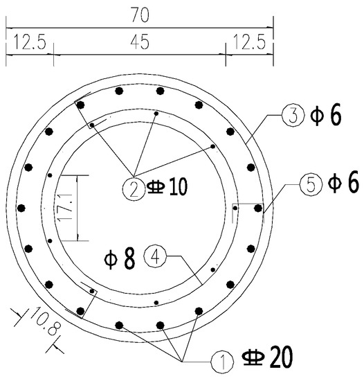 The specimens were poured with C70 concrete and filled with C40 concrete. The longitudinal steel bars were HRB400 steel bars, where 18 steel bars had a diameter of 20 mm in the outer ring and 9 steel bars had a diameter of 10 mm in the inner ring, and HPB300 spiral stirrups had a spacing of 100 mm. The main reinforcement of the pier column and the steel end plate adopts perforated plug welding, the size of the steel end plate was the same as the section of the pier column, the thickness was 10 mm, and Q235 (Q235 indicates a steel plate with a yield strength of 235 MPa) steel was used. The structure diagram of the scaled pier column is shown in Figure 6.