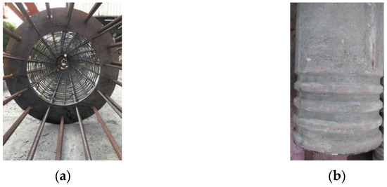According to the abovementioned improvement ideas, the new socket design scheme of the centrifugal pipe pier, as shown in Figure 3 and Figure 4, is finally proposed. According to the existing results, the ratio of the socket depth of the pile cap to the diameter of the pier was 0.7. The ratio of socket depth to base plate thickness was 2:1. The height of the cap was 1.5 m, the socket depth was 1 m, and the thickness of the bottom plate was 0.5 m. The insertion end of the pipe pier adopted rough interfaces, and the groove of the cap was made of a large-diameter corrugated pipe to form a groove, which could form a restraint effect on the caulking concrete. Anti-punch hanging bars were set at the bottom of the groove of the cap to enhance the shear resistance. The diameter of the reinforcing bars of the bottom plate was 25 mm, the diameter of the other bars was 16 mm, and the spacing between the bars was 100 mm. The pier was poured with C70 (C70 means the standard compressive strength of the concrete is 70 MPa) concrete and filled with C40 concrete. The longitudinal steel bars were HRB400 (HRB400 means hot-rolled ribbed bars with yield strengths of 400 MPa) steel bars, where 36 steel bars had a diameter of 28 mm in the outer ring and 18 steel bars had a diameter of 16 mm in the inner ring, and HPB300 (HPB300 indicates hot-rolled plain steel bars with yield strengths of 300 MPa.) spiral stirrups had a spacing of 100 mm.
