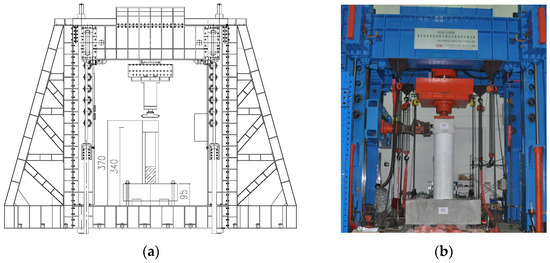 Test loading equipment was a 10,000 kN electro-hydraulic servo multifunctional structural test system, as shown in Figure 8. The vertical loading capacity was 10,000 kN in compression and 3000 kN in tension. The maximum stroke was ±300 mm. The horizontal loading capacity was 1500 kN, and the maximum stroke was ±400 mm. The test force measurement range and indication accuracy were 4%–100%, and the displacement resolution was 0.01 mm. Specimen S7 was subjected to axial force by means of the force control and the loading rate was 50 kN/min. The specimen was loaded in axial pressure only and slowly increased until it was damaged. The load increment was about 500 kN, and it was necessary to hold the load and observe the cracks and damage process at each load step. Because of the limitation of the test loading capacity, the maximum loading capacity of the testing machine was 10,000 kN. When the central loading was used, the specimen was not damaged when it reached 10,000 kN, so eccentric loading was applied after unloading in order to obtain the damage pattern of the precast piers. At eccentric distances of 5 cm and 10 cm, the specimens were not damaged. Until the eccentricity of the specimen reached 12.5 cm, the pier was damaged.