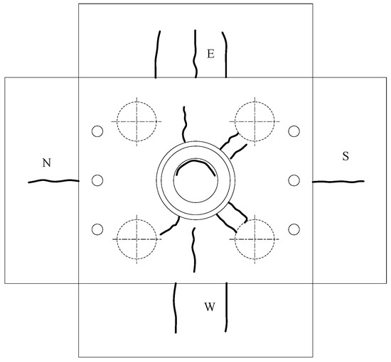 After the experiment, it was found that four cracks appeared in the grouting material, which was approximately evenly distributed along the circumference. A ring-shaped crack appeared between the corrugated pipe and the cap concrete, indicating that the grouting material and the pipe pier formed a whole. Under different loading conditions, the crack width was larger under eccentric loading. There were two to three cracks on the east and west sides and one crack on the north and south sides, developing from bottom to top. The distribution of cracks is shown in Figure 10.