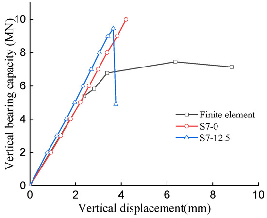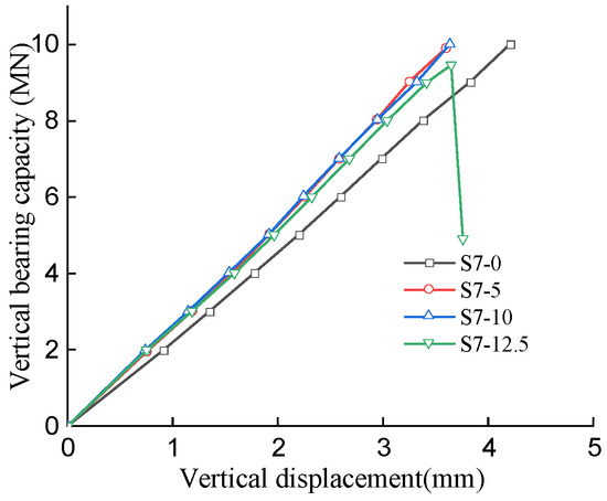 Figure 11 shows the vertical load–displacement relationship of specimen S7 with different eccentricity. It can be seen that as the eccentric distance increased, the stiffness of the load–displacement curve increased at first. At the maximum eccentric distance, the load–displacement curve suddenly dropped, showing the characteristic of brittle failure.