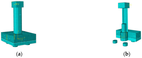 Taking the 1:2 specimen model as the object, finite element analysis was carried out on the pile cap of different structures and designs, and the influence of different factors on the vertical bearing capacity of the socket connection was analyzed. The concrete material was simulated by the plastic damage constitutive model. Using 3D element modeling, the precast pipe piers were modeled by partitions. The ideal elastic–plastic model was used for the anchoring end and the bottom of the cap, and the damage–plastic model was used for the splicing surface, as shown in Figure 12.