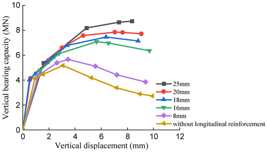 For different reinforcement ratios, there is no need to change the model in the finite element analysis; rather, we can just modify the diameter of the reinforcement material when assigning material properties, and then assign the material to the reinforcement section. The original diameter of the steel bar was 18 mm. For reference analysis, models with steel bar diameters of 8 mm, 16 mm, 20 mm, 25 mm, and no steel bar were created respectively. The finite element analysis results are shown in Figure 16. It can be seen that as the reinforcement ratio increased, the vertical bearing capacity also increased, showing a positive correlation. Specimens with low reinforcement ratios reached the plastic stage earlier than those with high reinforcement ratios. The bearing capacity of the specimens with diameters less than 20 mm appeared to decrease after reaching the maximum bearing capacity. The vertical bearing capacity of the model with a diameter of 8 mm and no steel bar had the largest and most obvious decrease, indicating that the steel bar has a great effect on the vertical bearing capacity. When the longitudinal reinforcement bar of the pile cap was increased from 18 mm to 25 mm, there was a 20% increase in the vertical bearing capacity. It can be seen that increasing the steel bar diameter of the cap is an effective method to improve the vertical bearing capacity of the cap.