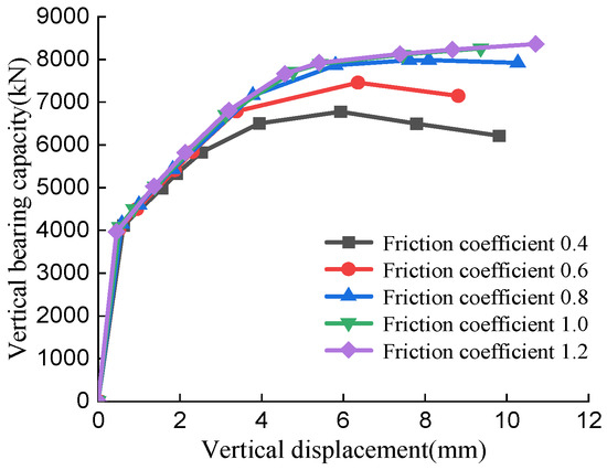 It can be seen from the above analysis that the increase of the friction coefficient increased the vertical bearing capacity of the structure and the selection of different friction coefficients had a certain impact on the vertical bearing capacity. The larger the friction coefficient is, the greater the vertical bearing capacity is. With the increase of the friction coefficient, the increase degree of the vertical bearing capacity decreased significantly. The final finite element analysis results of the two friction coefficients of 1.0 and 1.2 are not significantly different. The exact value of friction coefficient needs to be determined by future experimental research.